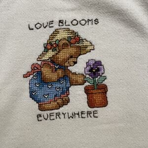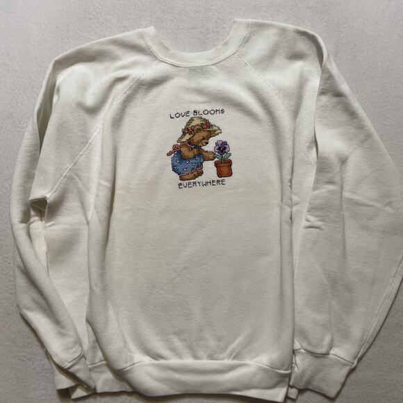 Vintage Needlepoint Cross Stitch Bear Flower Love Crewneck Sweatshirt L 80’s