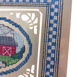 Crafted with meticulous attention to detail, this vintage Needlepoint features a charming Red Barn Landscape that evokes the quaint allure of the countryside farmhouse. Unique in that the Needlepoint is directly on the metal.. The piece showcases the timeless artistry of Needlepoint, boasting a rich tapestry that is both visually engaging and exquisitely detailed. The handmade nature of this item ensures that each piece is unique, making it a standout addition to any collection or decor. The frame adds a touch of classic elegance, providing a perfect showcase for the intricate needlework. Whether displayed in your living room or adorning a cozy nook, this framed Needlepoint brings a piece of rustic beauty into your home. Please note the left top and lower corners have become detached but does not take away from the beauty of piece.