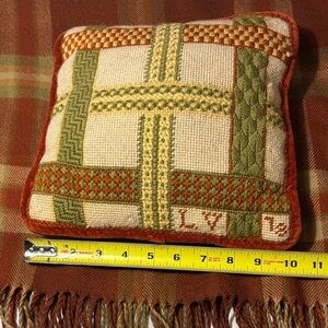 Accent pillow featuring a plaid design with intricate hand needlepoint patterns. Highlights include orange, green, and cream colors. It is hand-embroidered in wool and backed in burnt orange velvet, with hand-sewn cording around the edges.