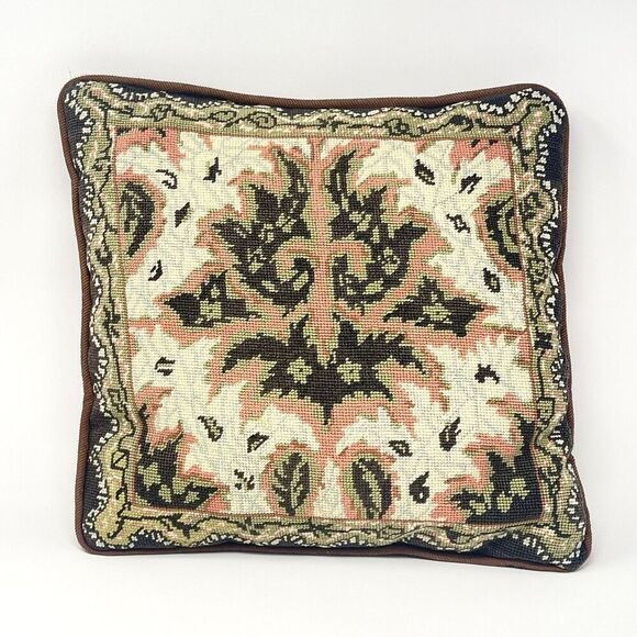 Vintage Needlepoint Pillow Peach Brown Green Leaf Design 13” x 14”