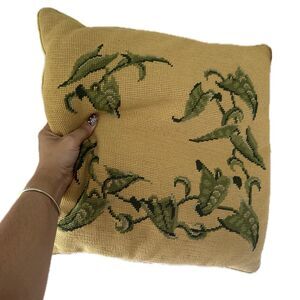 Vintage Needlepoint Vine Leaves Velvet Back Square Accent Pillow Decor