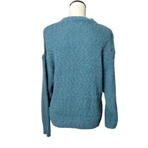 Vintage 80s or 90s Needles and Yarn women's sweater in size large. Nubby textured acrylic fabric in blue and white with floral applique and pearl bead accents. Very unique.