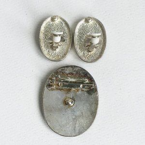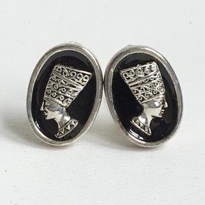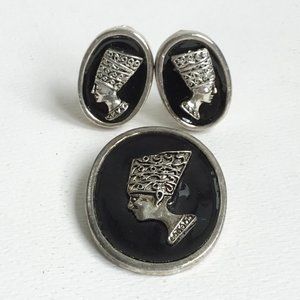 Vintage Nefertiti Egyptian Revival Silver Tone Black Enamel Oval Brooch Earrings
