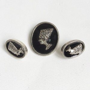 This set includes clip-on earrings and a brooch. They feature a raised profile of Nefertiti's and black enamel.