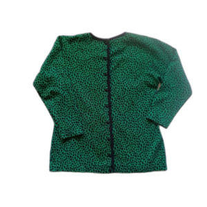 This long sleeve 100% cotton top closes in the back with buttons and has black trim at the neckline and button closure.