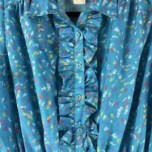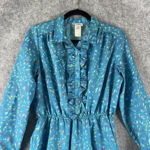 Vintage Neiman Marcus Dress Womens Medium Blue Printed Ruffle Artsy Retro USA Made