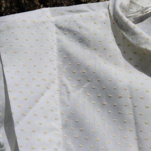 This white button down with a cream swiss dot pattern is a unique piece, perfect for a farmcore, cottage core, or historybounding style. Ruffling on front & back add a feminine touch. No tags beyond the Neiman-Marcus tag; this item at least pre-dates 1988, when Neiman-Marcus stopped using the hyphen in their branding, but based on the style and tag, I would guess this piece is more likely from the 60s or early 70s. Lightweight fabric means it is slightly see-through. See comments for more info