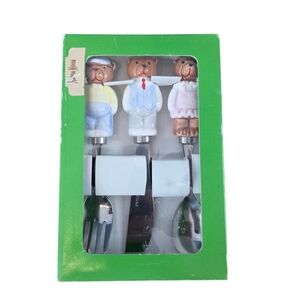 Adorable vintage Neiman Marcus teddy bear flatware set, featuring 3 stainless steel pieces with hand-painted ceramic bear handles. This boxed set includes a fork, knife, and spoon, each topped with a whimsical bear figurine (dressed as a sailor, a gentleman in tie, and a lady in a dress). Made in Taiwan, stainless steel construction.