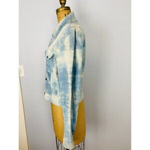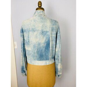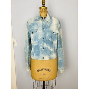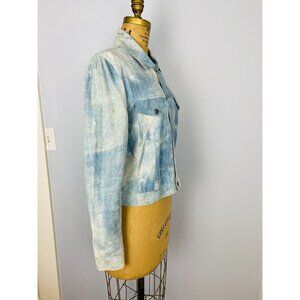 Tie dye like pattern in blue and white. Has the look of a denim jacket, but it is leather.
