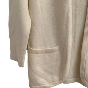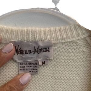 Vintage Neiman-Marcus 100% Cashmere Open front sweater Sz M. Such a gorgeous knit, two front pockets, soft and warm. Two tiny holes on left side and sleeve(picture attached). Easy fixes with needle and thread.