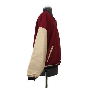 Great retro find of a wool and leather varsity jacket in maroon / cream with a satin liner.