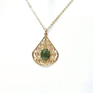 Vintage Nephrite Green Stone Gold Plated Pendant Necklace & Earrings Set
