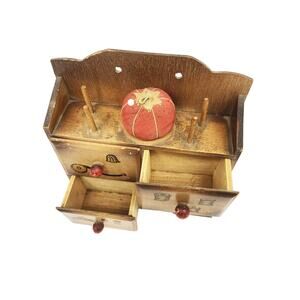 Vintage Nevco Japan Small 4 Drawer Wood Sewing box w Tomato Pin Cushion on Top