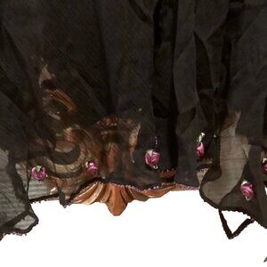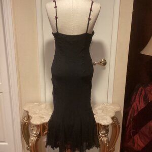 The ECI Vintage Black Silk Floral Detail Beaded Fairy Dress with a Sharkbite Hem is a stunning and unique choice for weddings or parties. This sleeveless dress features a V-neckline and is accented with beaded details and satin rosettes, giving it a whimsical and feminine look. The sharkbite hem adds a modern touch to the midi length silhouette, making it a perfect option for those who want to stand out and make a statement at special events