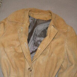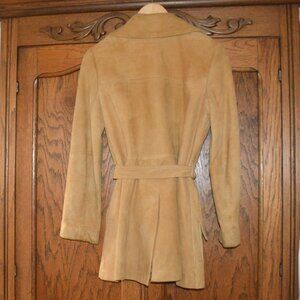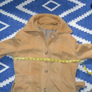 Gorgeous vintage New England Leather SUEDE tan mod Mod Boho belted coat jacket, size XS/S. This suede is like butter. Super soft. Minor wear/spots/dirt.