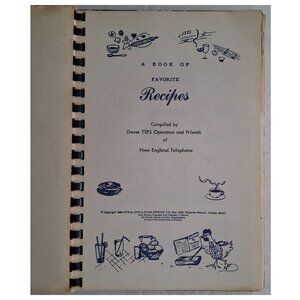 Vintage community cookbook Favorite Recipes From Our Best Cooks, compiled by Dover TSPS Operators and Friends of New England Telephone, printed by Circulation Service, Shawnee Mission, Kansas, fundraising programs, 1979. Recipes are credited to contributing individuals. Spiral bound, approximately 6 1/2 by 9 inches, 96 pages plus an unnumbered basic kitchen info section at end, along with calendars for 1980 1981 1982. Vintage item, cover worn, back cover stained/soiling, overall aging/yellowing, no handwriting or markings, no tears.