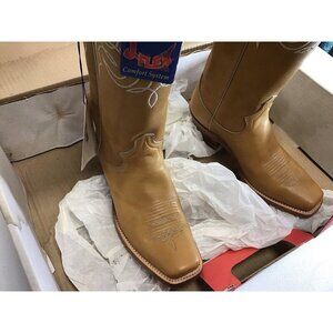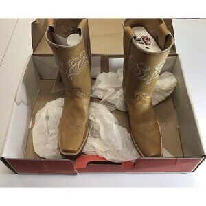 🤠This product is a pair of vintage women's Justin cowboy boots in size 6, with a square toe shape which ironically is on-point and in style also a low block heel. They feature an embroidered logo design, leather outsole and lining, and are suitable for a variety of occasions including casual, formal, or workwear. These boho/hippy style boots are perfect for adding a touch of Western flair to any outfit or a festival outing. With a mid-calf shaft style and comfortable features this boot features “J-Flex technology”these boots are a versatile and stylish addition to any wardrobe. Never worn in box with tags, box has seen better days but given the age it amazing to still have the box or tags. These boots are truly amazing 🤩