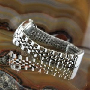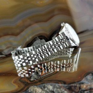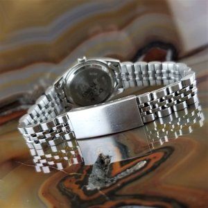 New Old Stock ~ Vintage JOSEPH BERNARD Silver Tone Jubilee Bracelet Watch ~ Polished Silver Tone Coin Edge Bezel ~ Case is Approx. 26MM Wide ~ Brushed Steel Bracelet with Polished Steel Accents ~ Fold Over Locking Clasp ~ Watch will Fit up to a 7.50" Wrist ~ Rose Gold Tone Dial with Silver Tone Arabic Markers and Hands ~ Diamond Accent at 12:00 ~ New Battery Installed ~ Runs Great ~ All Sales Final on Watches ~ Shipped USPS Mail.