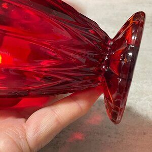 These date to c.1930s before New Martinsville was bought by Viking Glass. Look at how the light shines through these throwing off a brilliant ruby glow. The footed base has a slight amberina effect; the upper part is pure red. Imagine these on your holiday table!