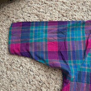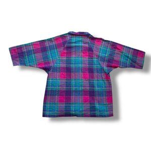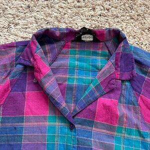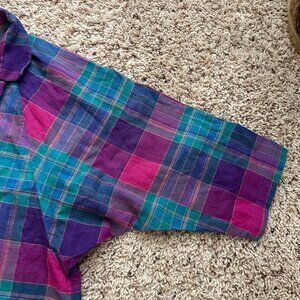 Vintage 80s madras plaid short sleeve button up shirt by New Mints. Shades of blue, puple, and pink. Collared neckline, button front closure, 100% cotton.