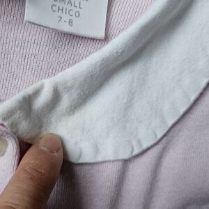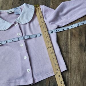 Vintage New Moves Collared Cardigan Sweater Girls' Size Small (7-8 years) Made in USA, 50% cotton, 50% polyester. Tag size 7/8, but runs small. Check all measurements in the pictures to determine the fit. Cropped style. Light yellow stains on collar; not very visible. Check the pictures for more information. E