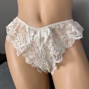 Listed is a vintage Natori hi cut, cheeky all lace ivory panty, with satin swirl embroidered applique on front. Lace is crisp.