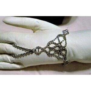 This fantastic set would be the envy of everyone with its sparkle and design perfect for a romantic wedding, special party, Prom or other event! Using the best of New Vintage Swarovski crystal Rhinestones and finish in Rhodium platin chain and the findings are Sterling Silver ! Hand flower or slave bracelet as the ring is slave to the bracelet and the matching necklace!