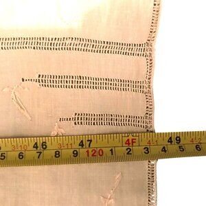 This 48-inch vintage tablecloth showcases intricate lace cut-out detailing in a neutral tan hue, adding a touch of timeless elegance to your dining decor.