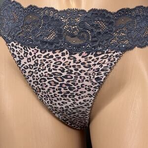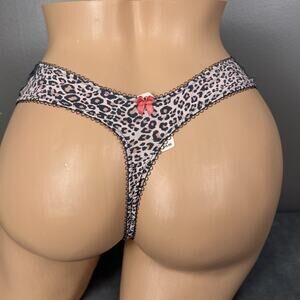 Listed is a vintage Y2K 2009 Victoria's Secret Dream Angels thong panty, animal print, silky smooth second skin satin type nylon/spandex fabric with gray wide lace, bow detail at back.