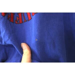 Condition: pin hole front, graphic worn on top, repair made on sleeve
