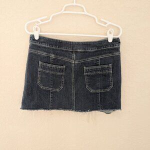 Adorable denim mini skirt with tiny pocket flaps with buttons and raw distressed hem. In great condition with no defects, size 6.