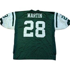 The product is a vintage New York Jets Curtis Martin Starter jersey in size 54 XXL. It is officially licensed by the National Football League (NFL) and features the classic green color of the team. This authentic pro line jersey is perfect for male fans of the New York Jets, ideal for wearing during the regular season games. The brand, Starter, is known for its quality sports apparel, ensuring a comfortable and stylish fit for any football enthusiast looking to represent their favorite team.