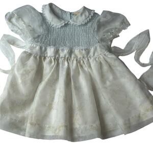This darling vintage New York Kids dress (Style 8829A, Size 4) is a timeless piece made in the USA. Featuring a delicate pastel floral print over a sheer organza overlay, sweet puff sleeves, a Peter Pan collar trimmed in lace, and a light blue ruched bodice, it buttons up the back and includes a sheer tie-back sash. The colors are even more gorgeous in person—photos don’t do it justice!