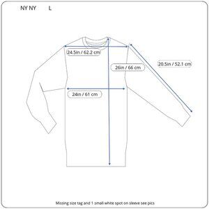 Missing size tag, small white spot on sleeve, wash wear.