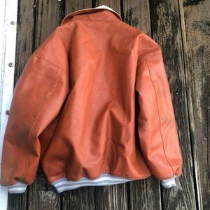 Vtg New York Orange Cream Leather Athletic Jacket Sz Regal Dean Polyester Vinyl 90s