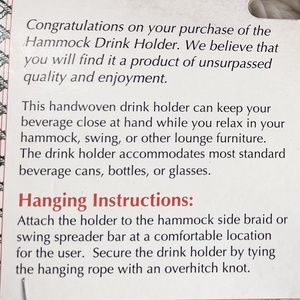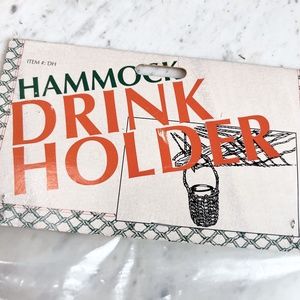 Vintage New in Bag Hammock Rope Drink Holder. Handwoven drink holder keeps your drink close while you relax in your hammock, swing, or other lounge furniture. Holds standard beverage cans, bottles or glasses. Makes a great gift. Excellent new condition.