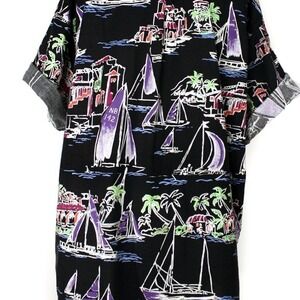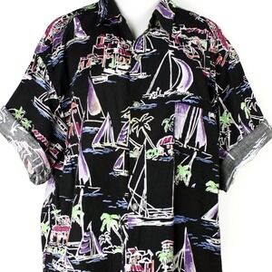 Vintage Newport Blue Hawaiian Shirt Tropical Sail Boat Print Black XL - Hey Viv
