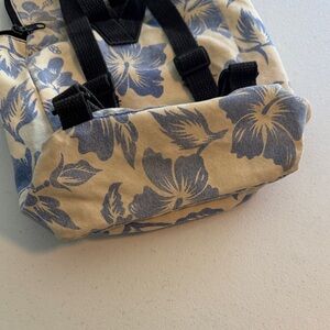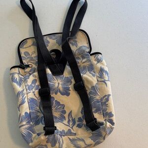 Playful vintage mini backpack in blue & cream tropical print by Newport Canvas Company. Lightweight, 100% cotton, with adjustable straps—perfect for concerts, beach days, or everyday use. Well-loved but in good condition, some mat marks as shown. A charming piece for vintage and casual style lovers.
