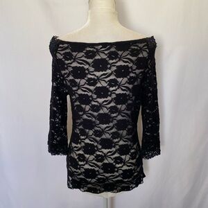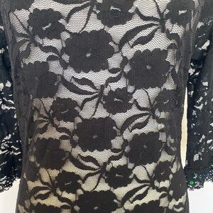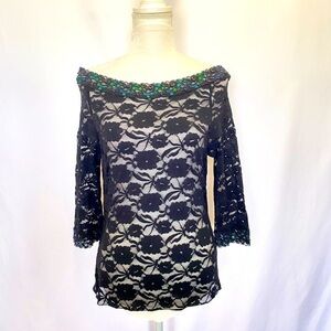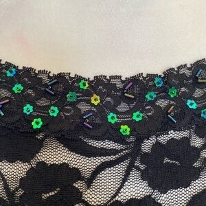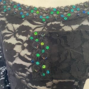 Vintage Newport News black floral off the shoulders lace top with green flower sequin trim around the neckline. NWOT...size Large...no flaws noted...see photos for care details...032221