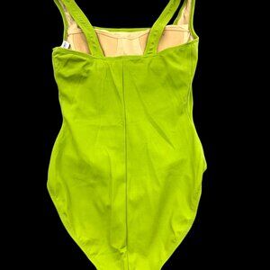 This vintage Newport News one-piece swimsuit features a vibrant lime green shade that commands attention. Designed with a flattering ruched bust, it enhances shape and provides comfortable support. Sized at 4, this timeless piece blends classic style with a bold, fresh color, perfect for making a confident statement by the water.