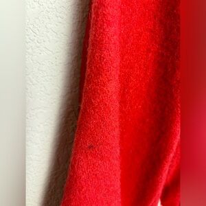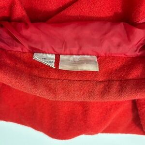 Vibrant red wool coat with oversized black buttons. Waist length with pockets. Fully lined. Very well made piece is perfect for adding a pop of color to your cold weather wardrobe!