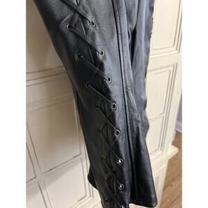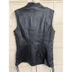 Vintage Newport News size 6 black leather motorcycle vest with lacing up both sides. Great condition. Zips up the front. Measures 18” from armpit to armpit and 24 1/2” long.
