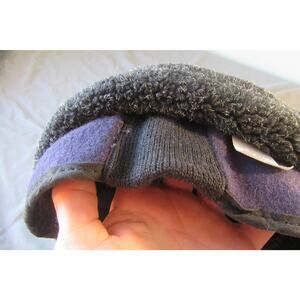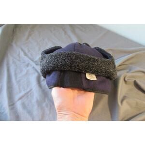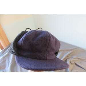 Vintage Newsboy Cabbie Elmer Fudd 80% Wool Winter Hat Ear Flaps Made USA Large. Navy blue with black. Elastic in back for snug fit. No visible rips holes or stains.
