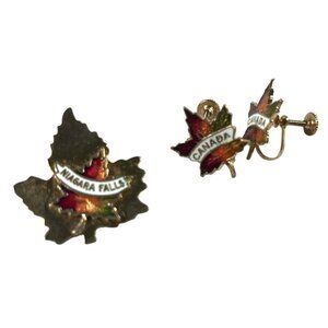 Vintage Niagara Falls Canada Maple Leaf Pin & Screw-Back Earrings Set Gold-Tone
