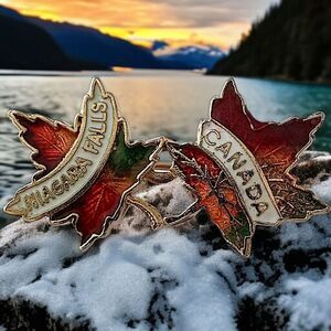 Vintage Niagra Falls Canada Pin Brooch Souvenir Double Maple Leaf Enamel Tourist