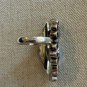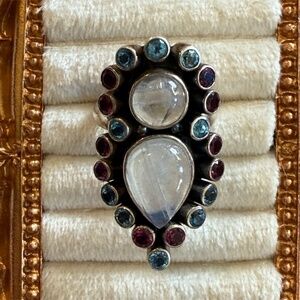 Vintage Nicky Butler sterling silver ring, size 8. Features a teardrop and round rainbow moonstone center, framed by faceted amethyst and blue topaz in a regal cluster design. Intricate boho-meets-romantic detailing.