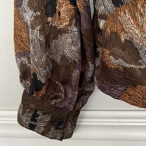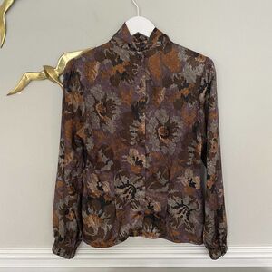 Vintage Nicola button back blouse in size 6. Would fit up to a modern size small. Brown with purple and black pattern. Scarf neckline. Satin hand feel. Excellent condition. No flaws to note. See pictures for measurements.