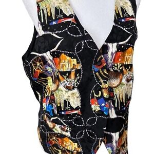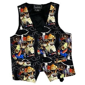 Vintage Nicole Miller Printed Vest Cowboy Rodeo Western 100% Silk Black Size Large