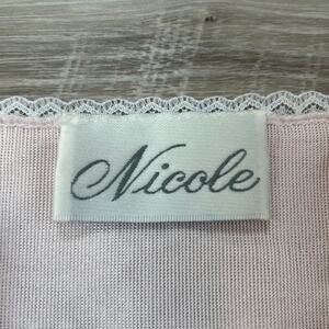 Vintage Nicole satin nightgown in baby pink with delicate white lace trim. Features a floral jacquard pattern, high lace yoke, spaghetti straps, and rounded hem. Made in the USA by ILGWU, likely 1980s era.