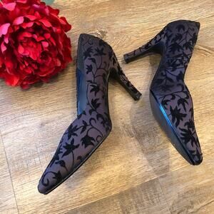 Vintage Night Life black patterned heels. 80’s prom heels. The insoles are lifted inside the shoe and will require to be re-glued or new inserts. Otherwise, the outside look of the shoe is in Excellent Used Condition. Size 8.5.